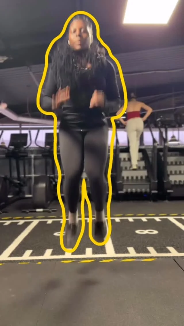 A woman in a yellow workout outfit sitting on a gym bench, appearing to rest after exercise, with gym equipment in the background.